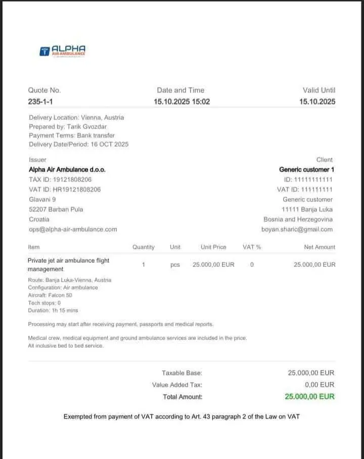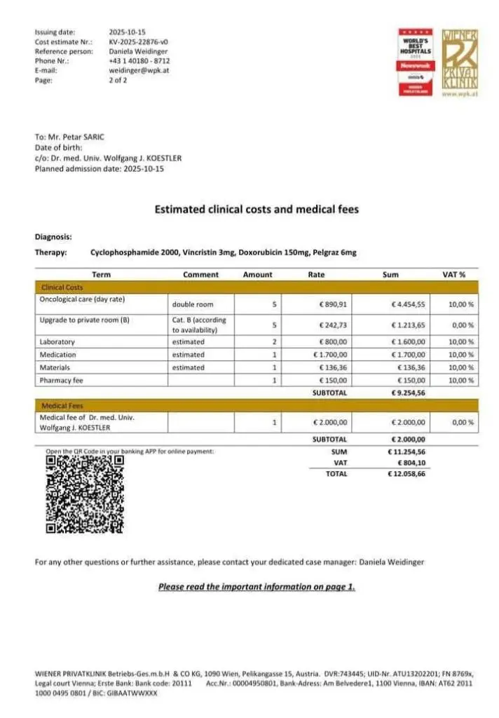 U nastavku instrukcije deviznog racuna kao i ponuda od klinike i aviotrasporta.