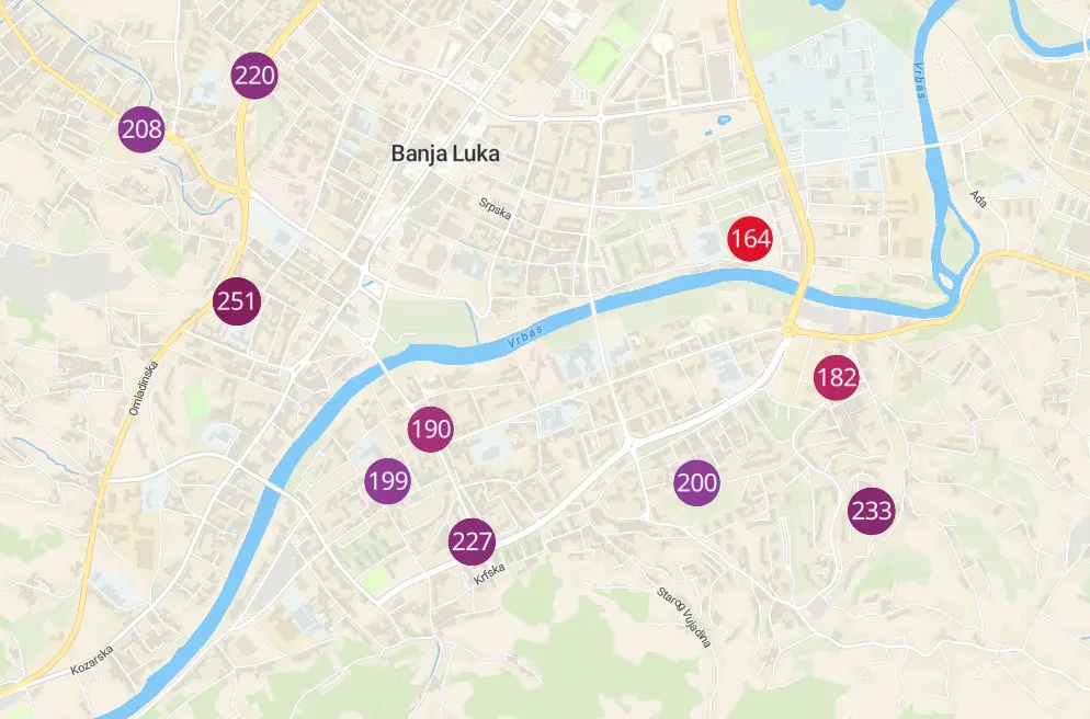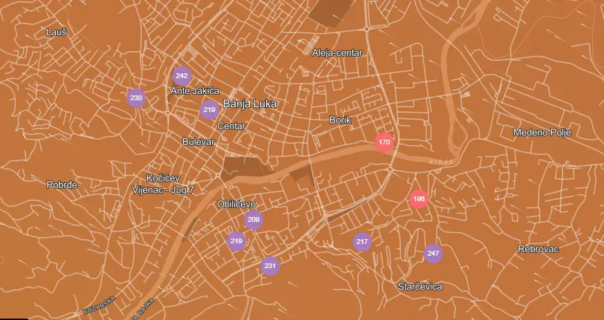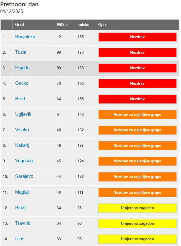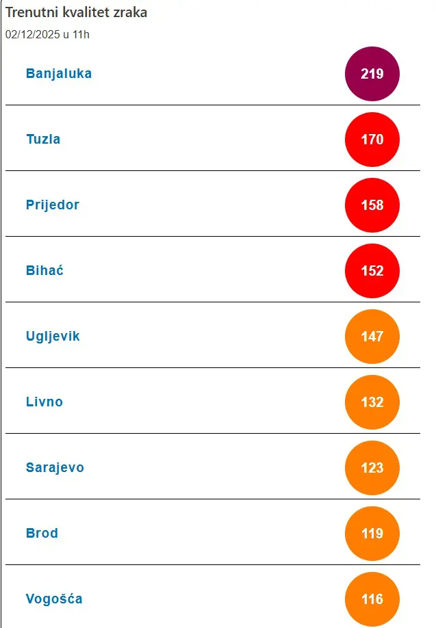 Banjaluka je trenutno najzagađeniji grad u Bosni i Hercegovini, pokazuju podaci mjernih stanica postavljenih u centru grada i u Lazarevu. Slična situacija zabilježena je i prethodnog dana, što ukazuje na nastavak veoma lošeg kvaliteta vazduha.