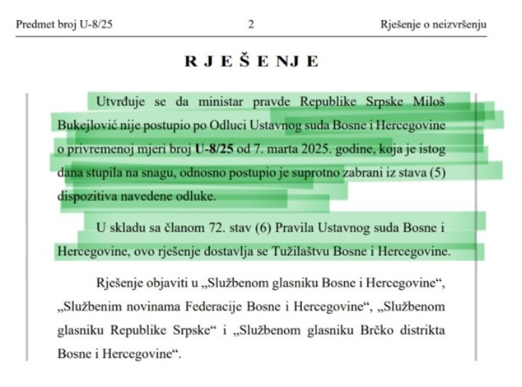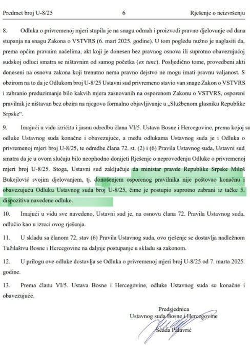 „Ministar pravde Republike Srpske Miloš Bukejlović svojim djelovanjem, odnosno donošenjem osporenog pravilnika, nije poštovao konačnu i obavezujuću odluku Ustavnog suda BiH broj U-8/25, čime je postupio suprotno zabrani iz tačke 5. dispozitiva navedene odluke.“