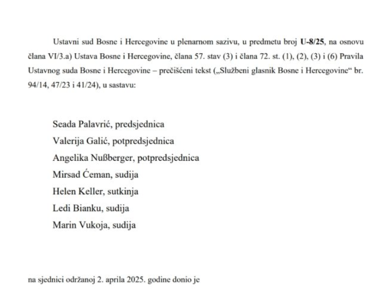 U obrazloženju rješenja, na osmoj stranici, Ustavni sud BiH je naveo: