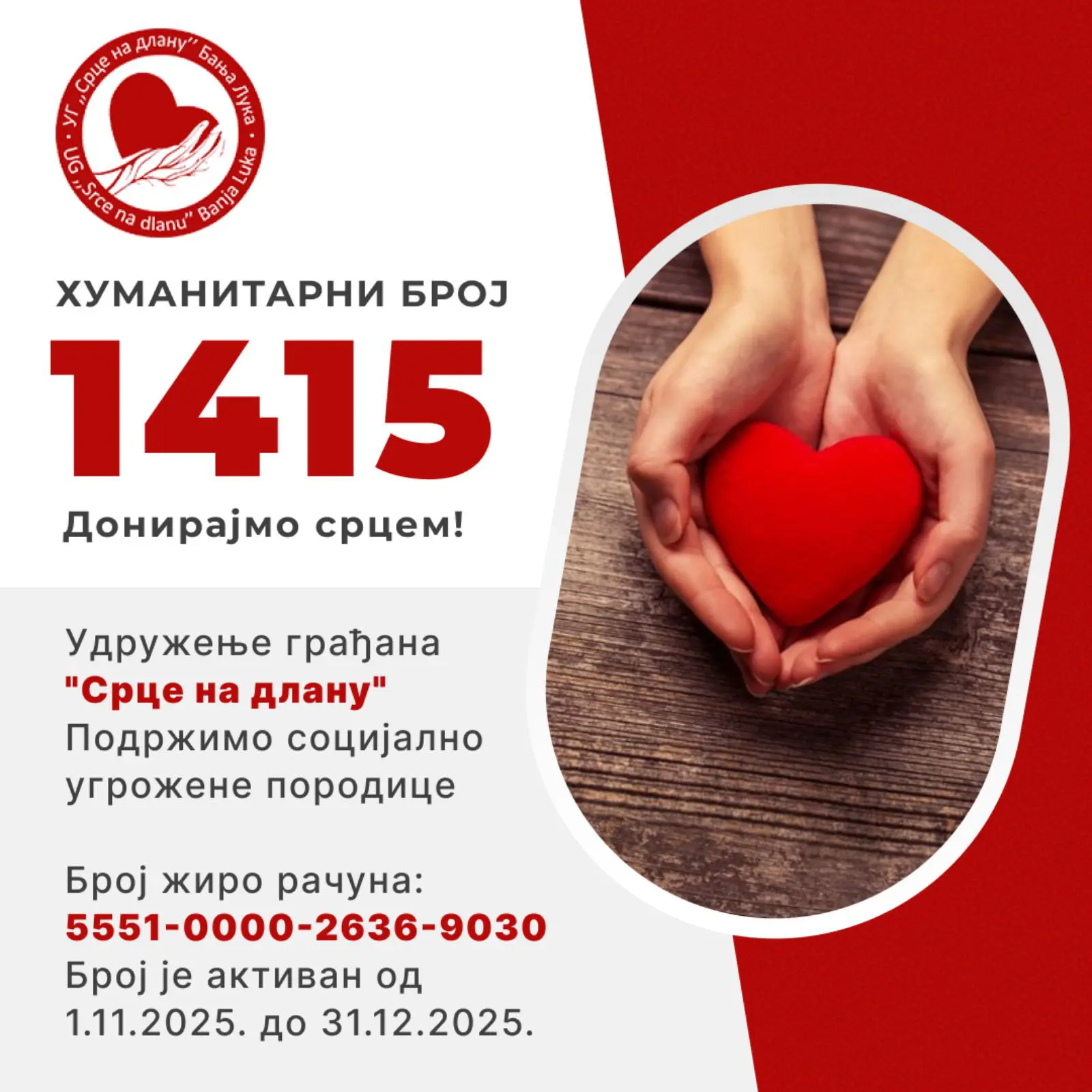 Udruženje građana „Srce na dlanu“ Banja Luka pokrenulo je humanitarni broj za socijalno ugrožene porodice i za korisnice i korisnike Udruženja građana „Srce na dlanu“ Banja Luka.