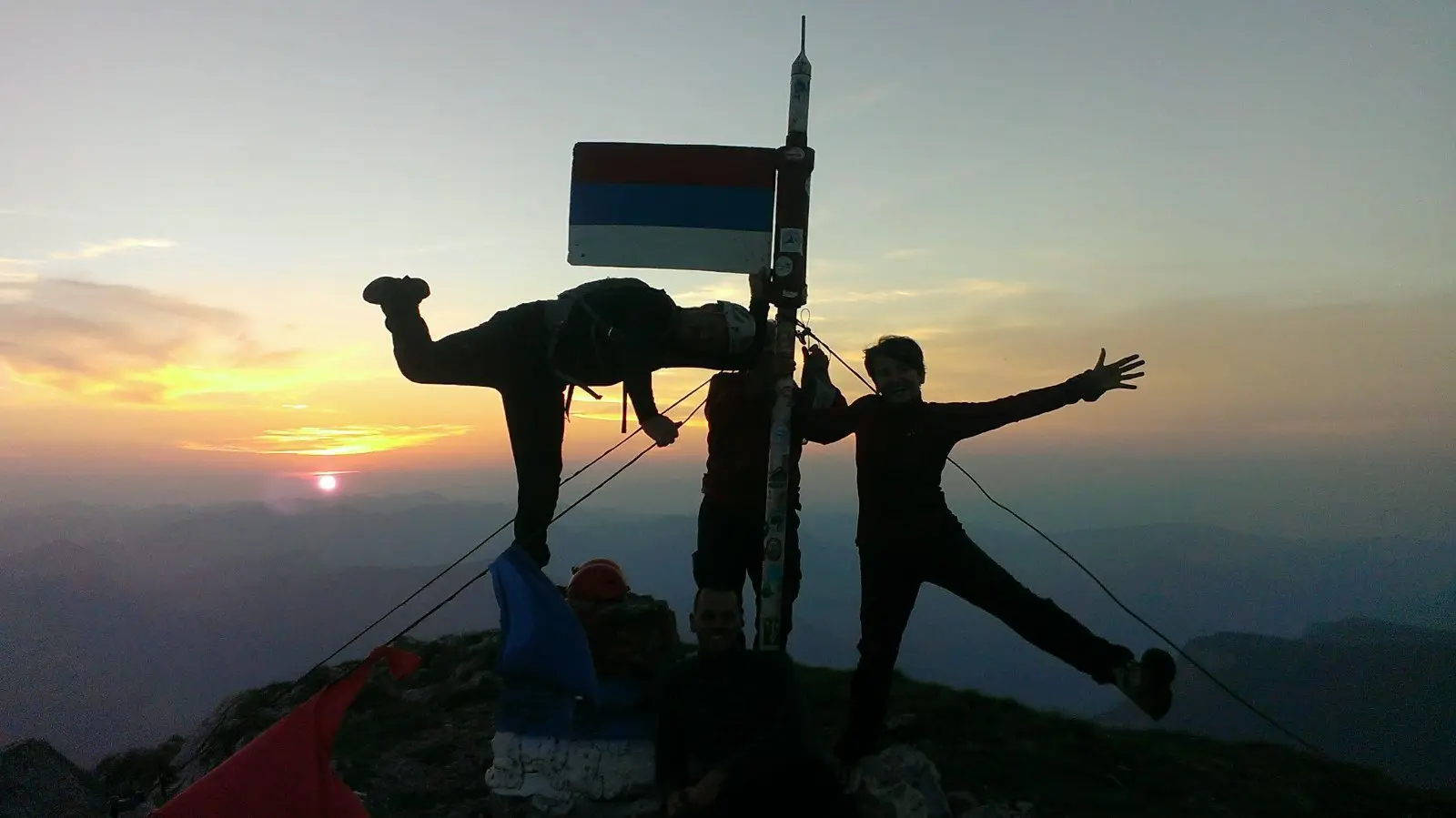 Dok se sunce sve više spušta ka zapadu i ostaje nam iza leđa, mi se relativno brzo približavamo vrhu i stižemo gore u sami smiraj dana. Radost, nalik dječijoj, nas stiže i zezamo se kako bi bilo prespavati tu. Koristimo to malo svjetlosti da napravimo par fotografija, na kojima se praktično vide samo naše siluete. Svejedno, obrisi krajolika su tu, kao i osmijesi i sreća, uz poneko blesavo poziranje. Ne čekamo da se smrkne, nego polako krećemo istim putem nazad, kako bismo dio u stijeni prešli za dana. Ostatak silaska prolazi uz čeone lampe lagano niz padine Maglića uz povremeno moje dozivanje njegovog imena i pitanje “gdje sada treba da idem dalje”. O tome se sljedeći dan šalio uz put dok je pripremao uže za brojne grupe planinara na usponu, a mi ponovo lagano s njim istim stazama, kao i prethodno veče.
