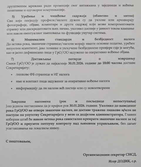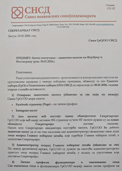 “Radi uspostavljanja jedinstvenog, organizovanog i kontrolisanog nastupa na društvenim mrežama u okviru izbornih priprema, obavezuju se svi Gradski odbori (GrO) i Opštinski odbori (OO) SNSD da najkasnije do 30.01.2026. godine izvrše sljedeće aktivnosti: