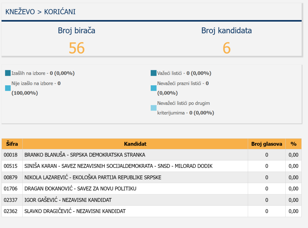 U biračkom mjestu Korićani, u opštini Kneževo, zabilježena je jedna od najneobičnijih pojava na prijevremenim izborima u Republici Srpskoj. Iako se na biračkom spisku nalazi ukupno 56 registrovanih birača, zvanični podaci pokazuju da na izbore nije izašla nijedna osoba. Izlaznost je tako iznosila 0,00%, što ovo biračko mjesto svrstava među rijetke slučajeve apsolutne apstinencije u izbornom procesu.