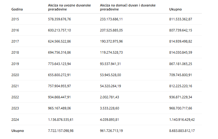 Novac prikupljen od akciza na duvan u BiH ne usmjerava se u zdravstveni sektor, koji već godinama grca u milionskim dugovima. Umjesto toga, sredstva se troše nenamjenski, a zapravo nije ni poznato koje sve budžetske rupe krpi taj novac. Samo u periodu 2015–2024. godine prikupljeno je gotovo 8,7 milijardi KM.