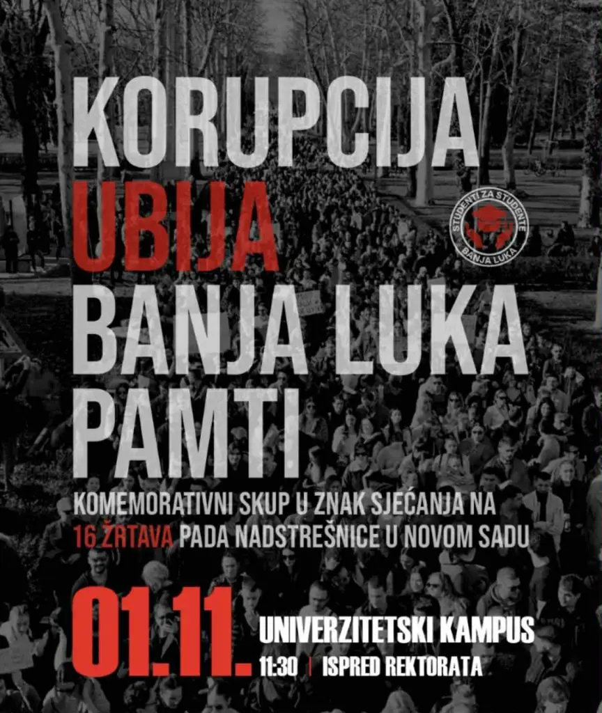 „Korupcija ubija, Banjaluka pamti“ – komemorativni skup u znak sjećanja na 16 žrtava pada nadstrešnice u Novom Sadu biće održan 1. novembra u 11.30 časova u Kampusu, ispred zgrade Rektorata.