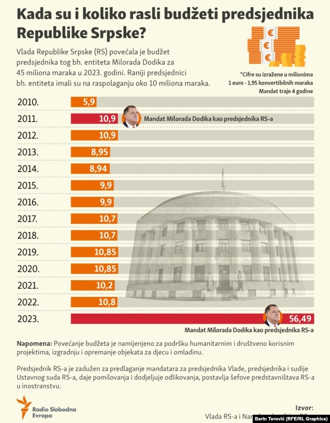 Budžet predsjednika Republike Srpskea je duže od decenije iznosio oko pet miliona evra, da bi doživio pravu “eksploziju” kada se Dodik vratio na ovu funkciju krajem 2022. godine.