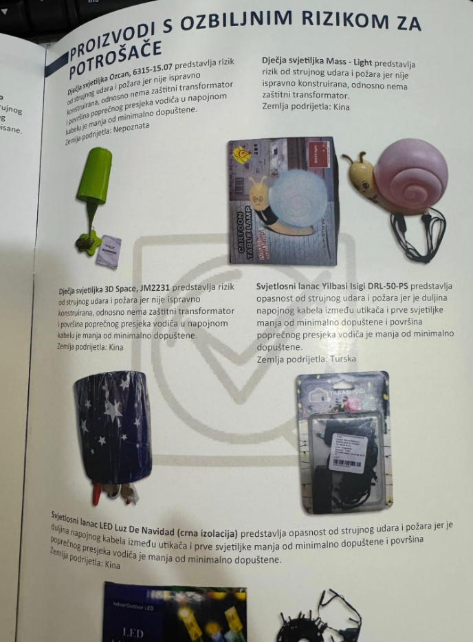 Najveći rizici dolaze iz neočekivanih izvora poput igračaka moje mogu oštetiti vid ili izazvati gušenje, ektrični uređajih uređaja koji mogu izazvati strujni udar ili požar, proizvoda za djecu s toksičnim hemikalijama ili laserske opreme bez ikakvih sigurnosnih upozorenja. Čak 84% ovih rizičnih proizvoda dolazi iz Kine. Mnogi nemaju odgovarajuće oznake ni deklaraciju. Nema uputstava za bezbjednu upotrebu. Nema informacija o proizvođaču. Samo niska cijena – i visok rizik.