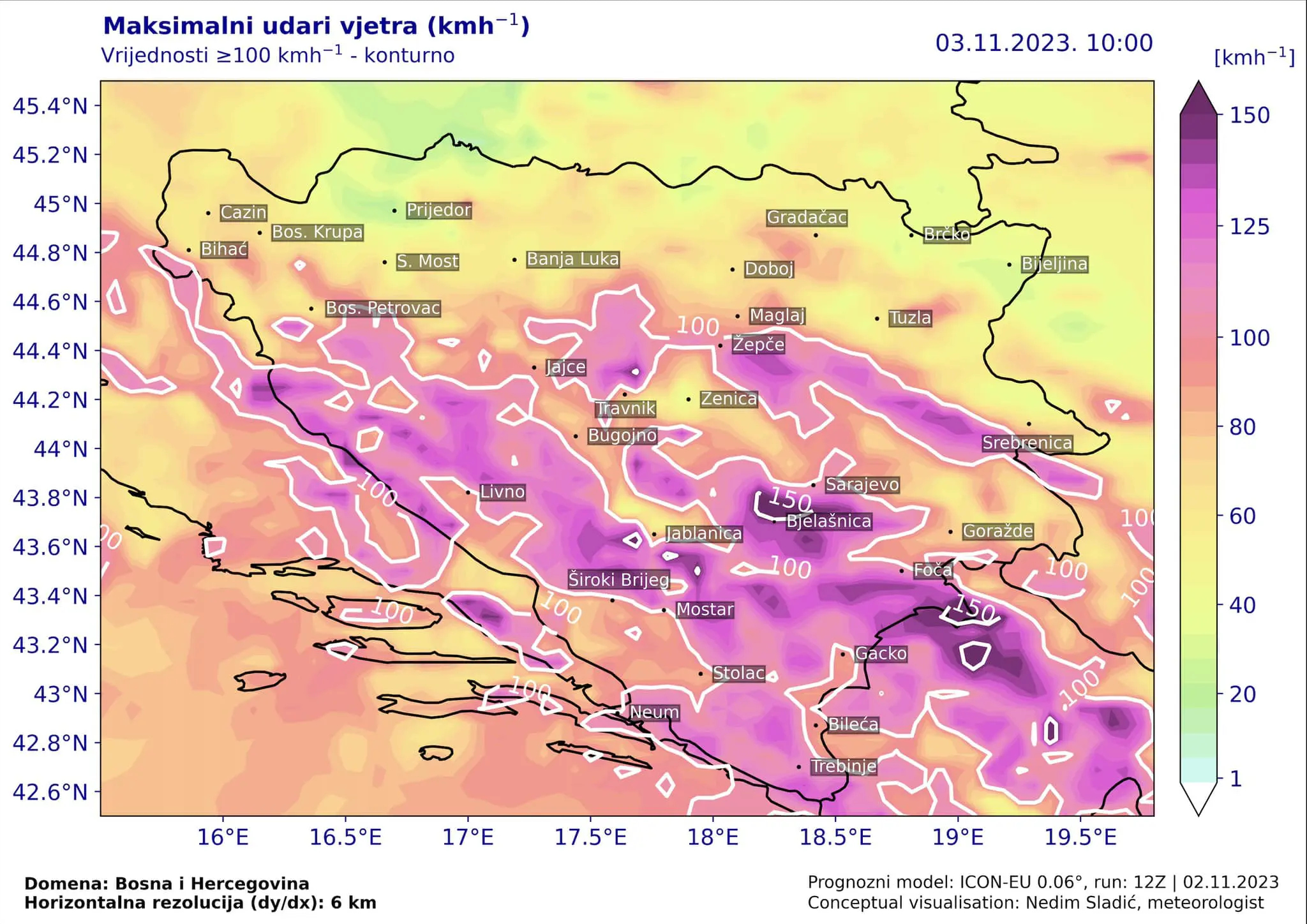 “Peak je prijepodne s udarima i preko 100 km/h (konturisano za vrijednosti >100 km/h), od poslijepodneva potom slijedi slabljenje juga. Pazite se dobro ujutro i prijepodne. Čuvajte se”, naveo je Sladić uz prognostičku kartu.