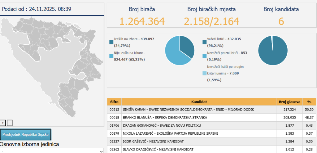 Na prijevremenim predsjedničkim izborima koji su održani u nedelju u Republici Srpskoj, Ukupno jeučestvovalo šest kandidata, iako je od početka kampanje bilo jasno da će se glavna borba voditi između Siniše Karana iz vladajuće stranke i opozicionog kandidata Branka Blanuše.