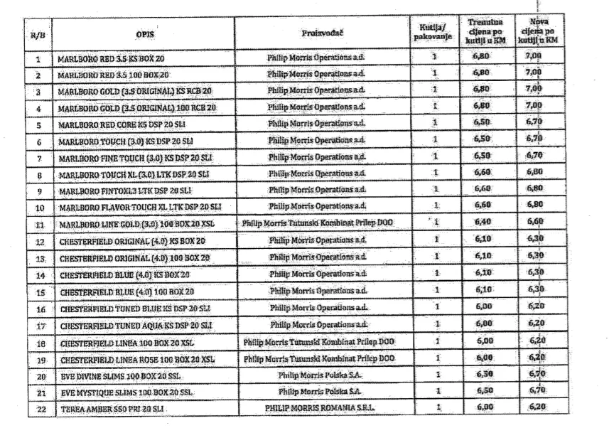 Izmjene cijena od 19. februara najavio je i Philip Morris BH, a cijene će u prosjeku rasti za 20 feninga te će najskuplje sada iznositi sedam KM.