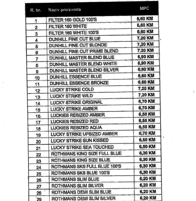 Najskuplje cigarete ovog distributera po novim cijenama iznosit će 29 KM.
