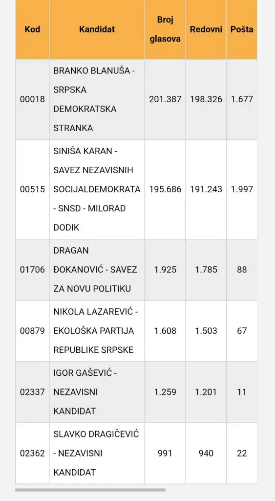 Pema ovim rezultatima Branko Blanuša, kandidat SDS-a ima 201.387 glasova, a Siniša Karan, kandidat SNSD-a 195.686 glasova.