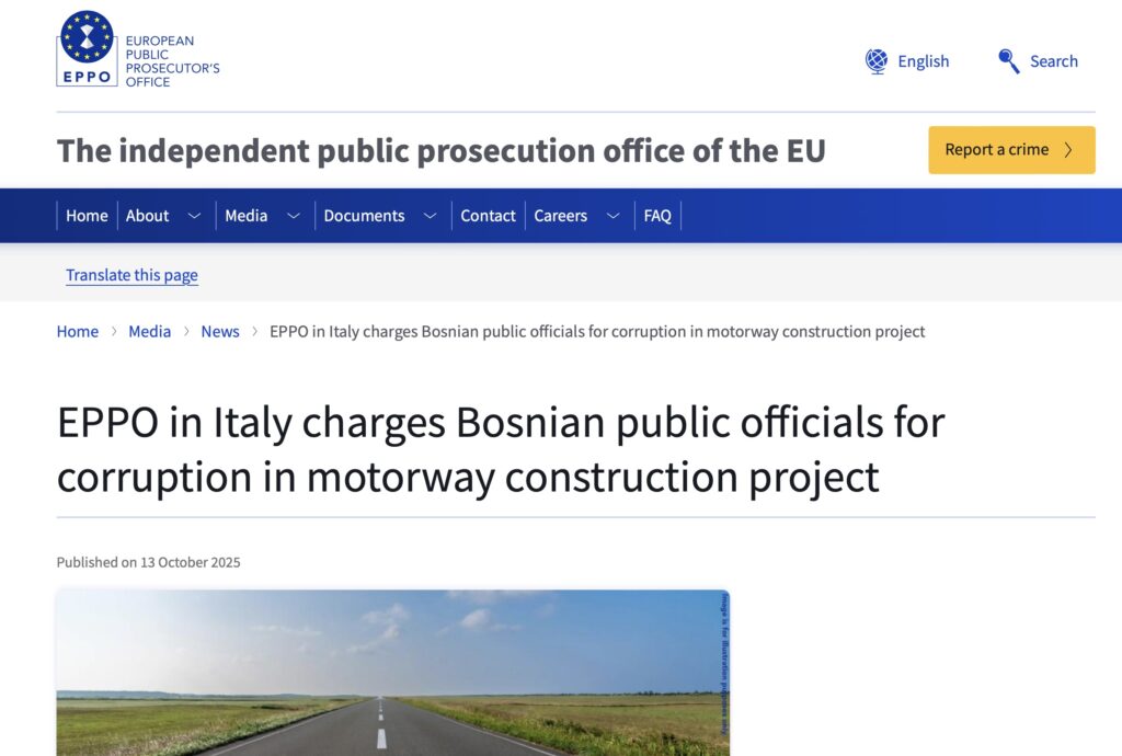 Evropsko javno tužilaštvo (EPPO) u Veneciji (Italija) oglasilo se saopćenjem za javnost u kojem su naveli da je osumnjičilo šest osoba, uključujući tri bosanskohercegovačka javna zvaničnika. Navode da se radi o navodnom prekograničnom korupcijom u građevinskom projektu Panevropskog autoputnog koridora, koji povezuje Mađarsku i istočnu Hrvatsku s BiH i Jadranskim morem.
