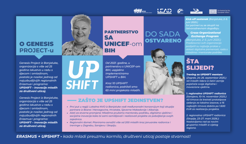 Genesis Project je organizacija iz Banjaluke sa više od 27 godina iskustva u radu s mladima, a ove godine prvi put predvodi međunarodni konzorcijum u okviru Erasmus+ programa: UPSHIFT, koji okuplja partnere iz BiH i zemalja regije kako bi osnažili 200 mladih lidera.