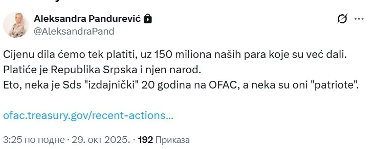 – Cijenu dila (dogovora op.a.) ćemo tek platiti, uz 150 miliona naših para koje su već dali. Platiće je Republika Srpska i njen narod. Eto, neka je SDS ‘izdajnički’ 20 godina na OFAC, a neka su oni ‘patriote’ – navela je Pandurević.