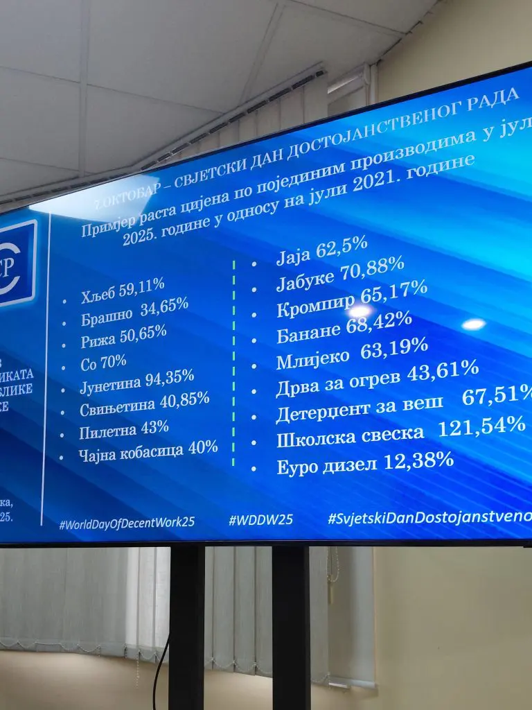 Cijene osnovnih namirnica kao što su jaja, mliječni proizvodi, meso, krompir i brašno porasle su i do 94%, dok su troškovi školskog pribora u pojedinim slučajevima skočili preko 120%. „Svjedoci smo da proizvođači ostvaruju ekstra profit u lancu prodaje, dok krajnji potrošači, među kojima su i naši radnici, svakodnevno osjećaju posljedice rasta cijena. Medijalna plata, koja bolje odražava realnu situaciju, često je i do 36% niža od prosjeka prikazanog statistikom koja uključuje direktorske plate“, ističe Radomir.