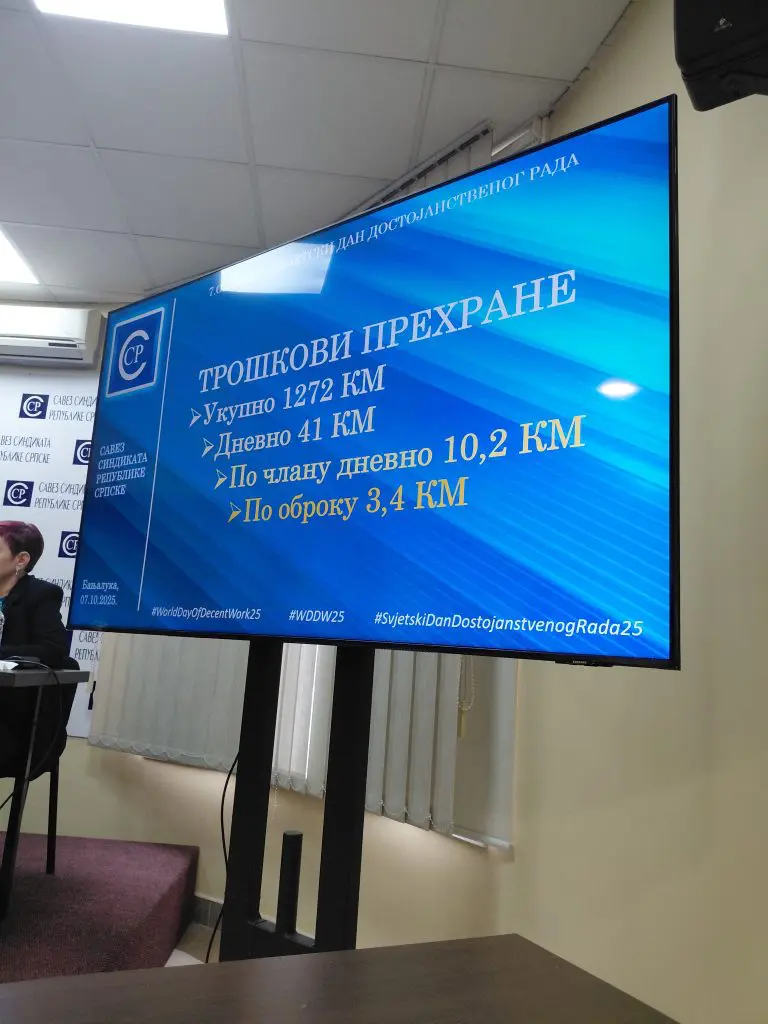Stanković je pojasnio da sindikalna potrošačka korpa realno odražava troškove četvoročlane radničke porodice, koja se sastoji od dva odrasla člana i dvoje djece školskog uzrasta. Samo troškovi hrane iznose oko 1.270 KM mjesečno, što znači da porodica dnevno raspolaže sa 41 KM za obroke, odnosno po obroku 13,6 KM. “Znači neko treba spremiti ručak, doručak za 4 osobe, pa samo burek za 4 osobe košta 20 KM. To nije nerealno, to nije pernapuhano, to je stvarnost“, naglasio je Stanković, dodajući da ovakvi iznosi jasno pokazuju koliko je teško sastaviti kraj s krajem od prosječne plate u Republici Srpskoj. Kada se dalje računa dođe se do podatka da se jedan član četveročlane porodice dnevno na hranu troši 10,2 KM ili 3,4 KM po obroku.