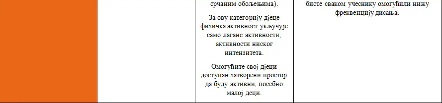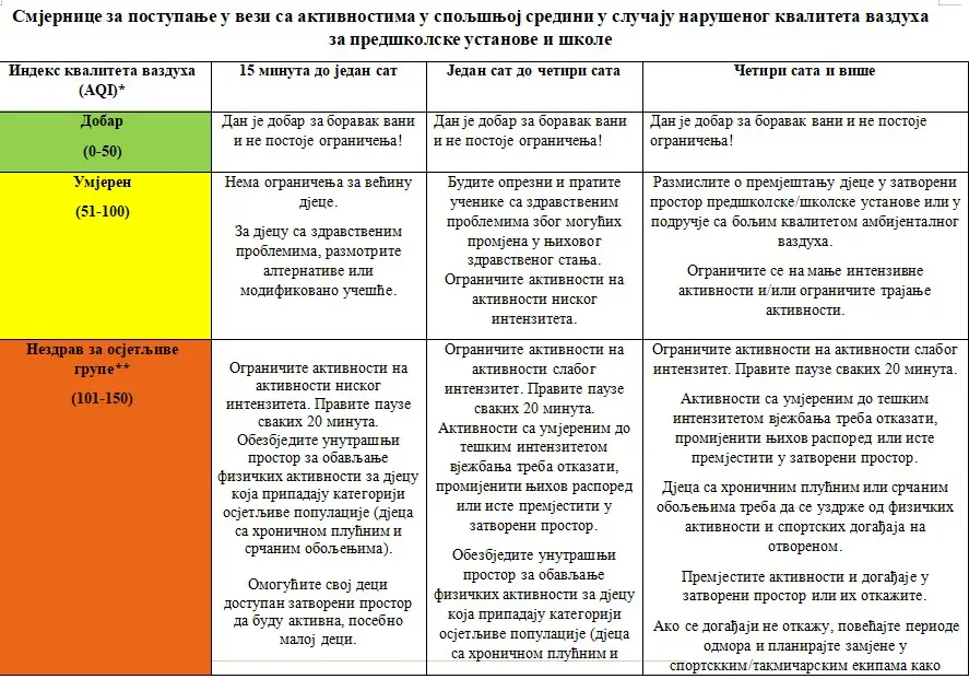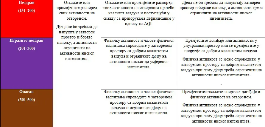 “Ne postoji tačno definisan vremenski period u kojem djeca mogu biti izložena narušenom kvalitetu vazduha bez zdravstvenih posljedica budući da i kratkoročno i dugoročno izlaganje zagađivačima vazduha može izazvati razne zdravstvene probleme. Kako se kvalitet vazduha pogoršava, povećava se potreba za većim brojem pauza, neophodno je smanjivati intenzitet aktivnosti i pratiti simptome. Zapamtite da su djeca sa zdravstvenim problemima osetljivija na narušen kvalitet vazduha”, ističe se u ovim smjernicama.