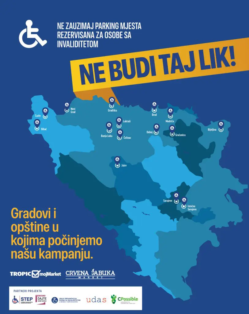 Kampanja se realizuje uz snažnu podršku partnerskih udruženja STEP, UDAS, C possible, Unije organizacija osoba sa invaliditetom BiH i udruženja Dajte nam šansu. Prve table su već postavljene na tri lokacije u Banjoj Luci, dvije u Sarajevu i jednu u Istočnom Sarajevu, nakon čega će uslijediti postavljanje i u drugim planiranim gradovima i opštinama.