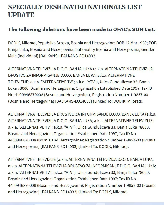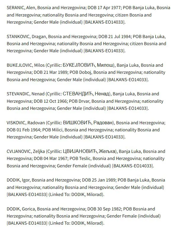 Preciznije, sa OFAC-ove liste obrisani su: Milorad Dodik, Željka Cvijanović, Nenad Stevandić, Staša Košarac, Radovan Višković, Siniša Karan, Alen Šeranić, Milan Bukejlović, Petar Đokić, Igor Dodik, Gorica Dodik, Srebrenka Golić, Dragan Stanković, Duško Perović, Dušan Perović, Branislav Okuka, Đorđe Đurić, Vladimir Perišić, Aleksandar Dobrić, Mirko Dobrić, Vlatko Vukotić, Marko Gujaničić, Nemanja Reljin, Džerard Selman, Dalibor Panić, Rajko Kuzmanović, Goran Filipović, Pavle Ćorović, Radmila Bojanić i Siniša Dodik.