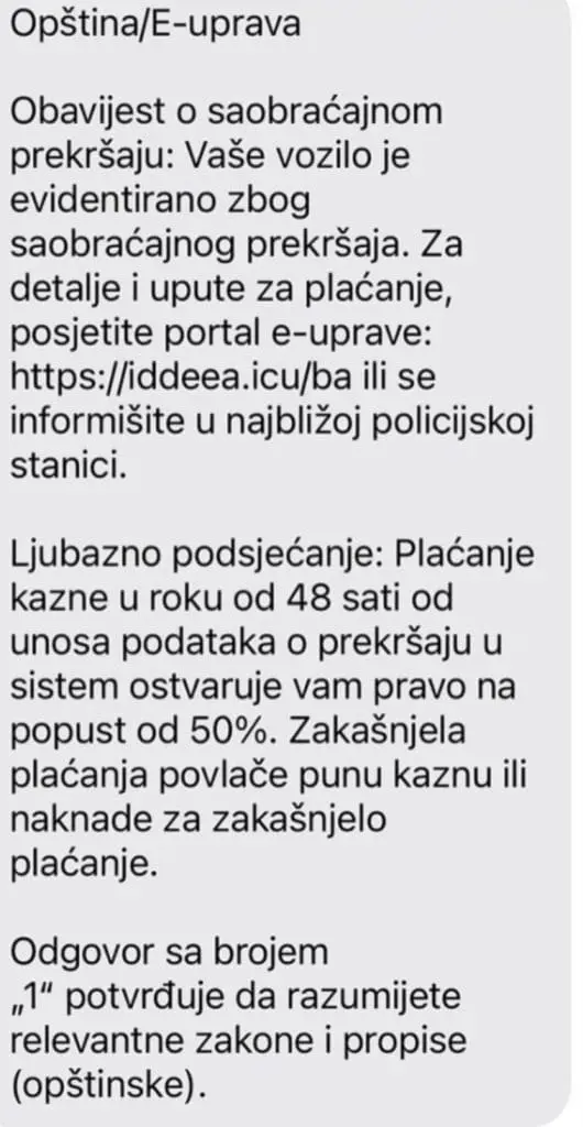 Ministarstvo unutrašnjih poslova Republike Srpske upozorava građane na pojavu lažnih SMS poruka koje se šalju širom Republike Srpske, a u kojima se navode neizmirene saobraćajne kazne i građani pozivaju da putem linkova IDDEEA BiH izvrše provjeru ili plaćanje.