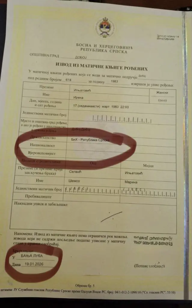 Portal CAPITAL je u posjedu rodnog lista Irene Ignjatović, izdatog danas, u kojem su rubrike „nacionalnost“ i „vjeroispovijest“ prazne. To znači da je kao jedini dokaz njene nacionalne pripadnosti poslužila lična izjava, što prema tvrdnjama pravnika nije dovoljno niti u skladu sa zakonom.