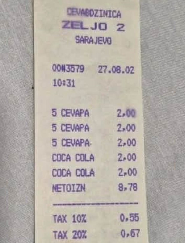 Na računu iz Ćevabdžinice Željo, koji je iznosio 10 maraka, moglo se kupiti tri porcije ćevapa i dvije Coca-Cole, objavio je Večernji.ba.