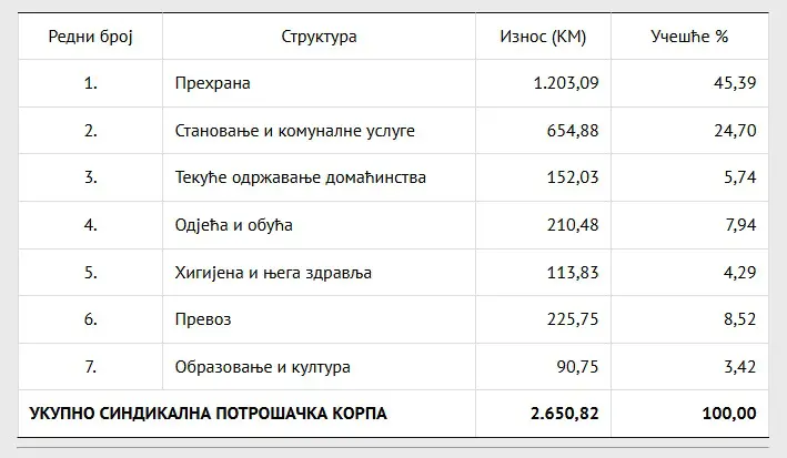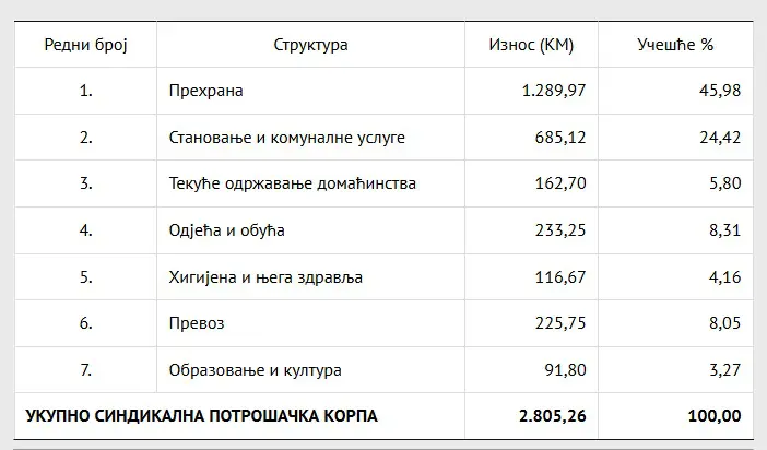 Najveći dio porodičnog budžeta i dalje odlazi na prehranu, za koju je u novembru bilo potrebno izdvojiti čak 1.290 KM. Troškovi stanovanja i komunalnih usluga iznosili su 685 KM, prevoz 226 KM, odjeća i obuća 233 KM, dok je za tekuće održavanje domaćinstva bilo potrebno 163 KM. U sindikalnoj potrošačkoj korpi nalaze se i izdaci za higijenu i njegu zdravlja, obrazovanje i kulturu, koji u prazničnom periodu takođe bilježe rast.