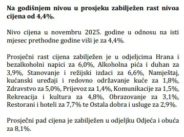 I Agencija za statistiku BiH saopštio je u novembru 2025. godine zabilježen rast nivoa cijena. Cijene proizvoda i usluga koje se koriste za ličnu potrošnju u Bosni i Hercegovini mjerene indeksom potrošačkih cijena u novembru su bilie veće od 0,5 %.