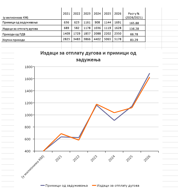 Podaci o kretanju zaduženja pokazuju da rekordno planirano zaduženje u 2026. godini nije izolovan slučaj, već nastavak dugoročnog trenda. Primici od zaduženja porasli su sa 636 miliona KM u 2021. godini na oko 1,69 milijardi KM u 2026., što predstavlja rast od približno 166 odsto. Istovremeno, izdaci za otplatu dugova povećani su sa 689 miliona KM na oko 1,63 milijarde KM, odnosno za više od 136 odsto. Grafički prikazi pokazuju da se primici od zaduženja i izdaci za otplatu dugova gotovo preklapaju, naročito od 2023. godine.