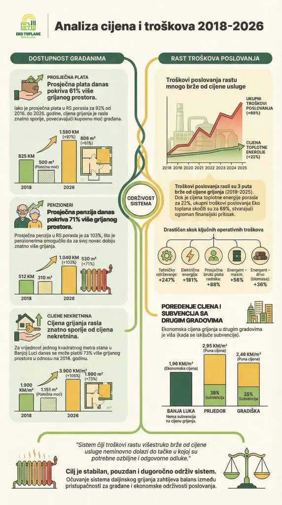 Prema podacima Zavoda za statistiku Republike Srpske, prosječna neto plata u Republici Srpskoj porasla je sa 825 KM u 2018. godini na 1.580 KM u 2026. godini. U istom periodu, cijena toplotne energije za krajnje korisnike povećana je sa 1,65 KM na 1,96 KM po kvadratnom metru. Posmatrano kroz ovaj odnos, za prosječnu platu u 2018. godini moglo se platiti oko 500 kvadratnih metara grijanja, dok se danas za prosječnu platu može platiti oko 806 kvadratnih metara grijanja. Ovaj podatak pokazuje da je rast cijene grijanja bio znatno sporiji od rasta prosječnih ličnih primanja.