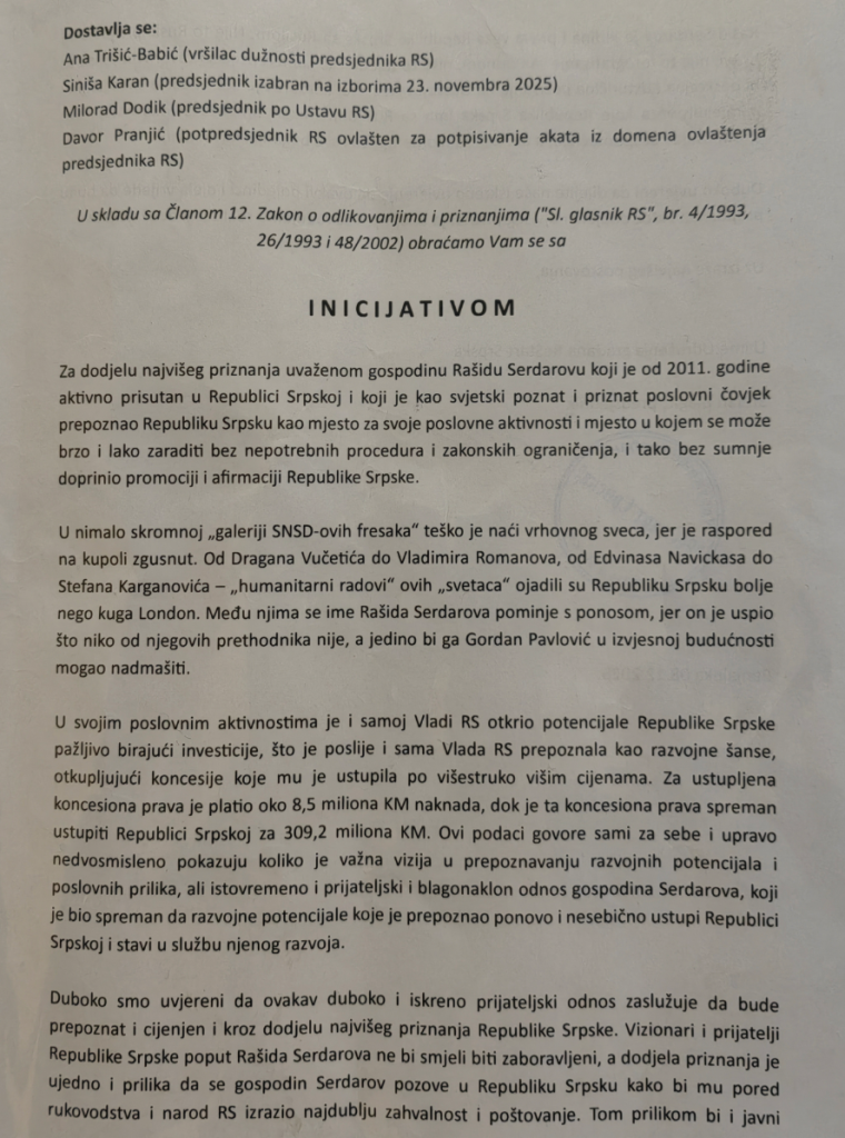 Organizacija ReStart Srpska danas je u Kabinet predsjednika Republike Srpske zvanično predala inicijativu za dodjelu najvišeg priznanja Republike Srpske – gospodinu Rašidu Serdarovu. Dokument je, potpuno u skladu sa aktuelnom političkom realnošću i različitim tumačenjima Ustava i izbornog procesa, upućen svim osobama koje u ovom trenutku obavljaju, zamjenjuju ili potpisuju funkciju predsjednika Republike Srpske: Ani Trišić-Babić, Siniši Karanu, Miloradu Dodiku i Davoru Pranjiću.