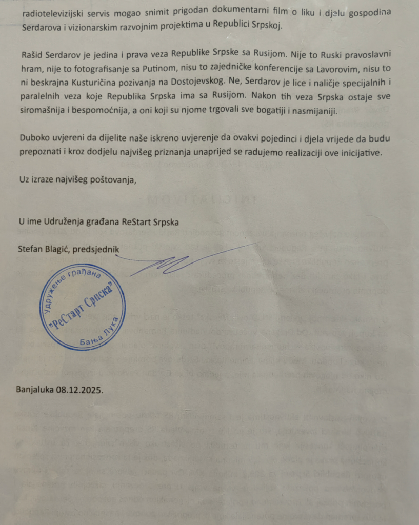 „Njegovo višegodišnje poslovanje u Srpskoj najbolje ilustruje kako se koncesije najprije ustupaju po povoljnim cijenama, a potom otkupljuju nazad po desetinama puta većoj vrijednosti – na štetu budžeta i svih građana. U tom smislu, smatramo da Serdarov predstavlja vrhunac jedne epohe: epohe ‘specijalnih i paralelnih veza’ u kojima Republika Srpska redovno ostaje bez resursa, dok pojedinci koji se predstavljaju kao prijatelji i vizionari odlaze bogatiji. Upravo zbog toga smo predložili da se gospodinu Serdarovu uruči najviše priznanje RS – jer bi ta odluka na najjasniji način zaokružila političku i ekonomsku logiku koje vlast godinama provodi i brani“, navode iz ReStarta.