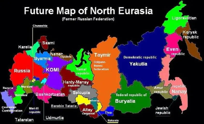 Stvar je čak i gora. Mnogi ozbiljni ljudi upozoravaju da bi poraz putinista u Ukrajini, naročito ako bude ponižavajući, mogao dovesti do kolapsa Rusije. General Leonid Ivashov nedavno je ponovio to upozorenje. Zlokobna je činjenica da tema disolucije Rusije postaje sve normalniji dio javnih rasprava širom svijeta, a sve češće u javnosti možemo vidjeti karte poput ove: