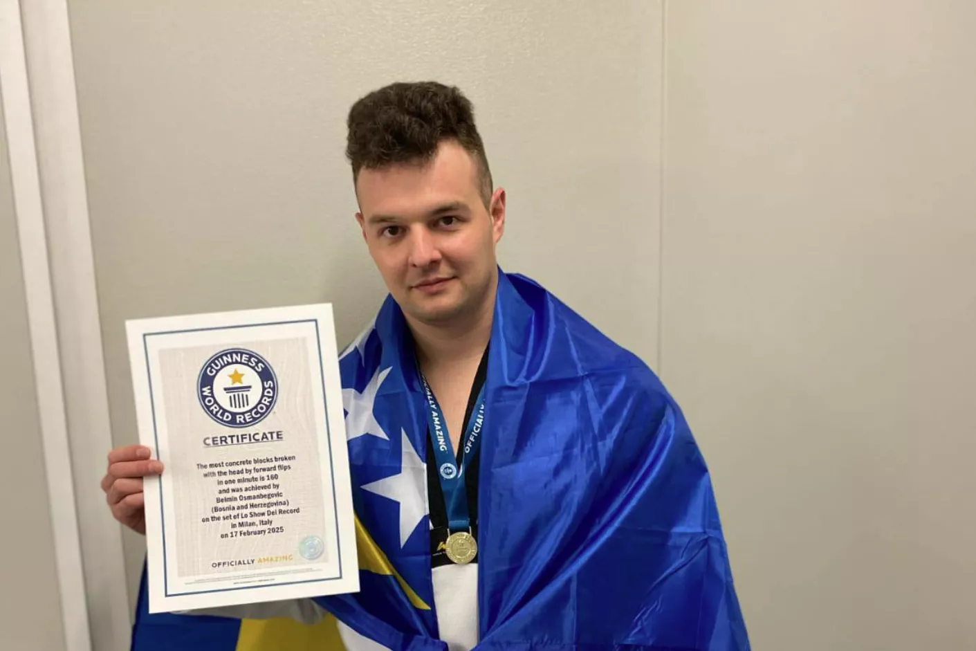 Naime, Belmin je u Milanu za 50 sekundi salto akcijom u vazduhu polomio 160 ploča i tako postavio novi Guinnessov rekord.