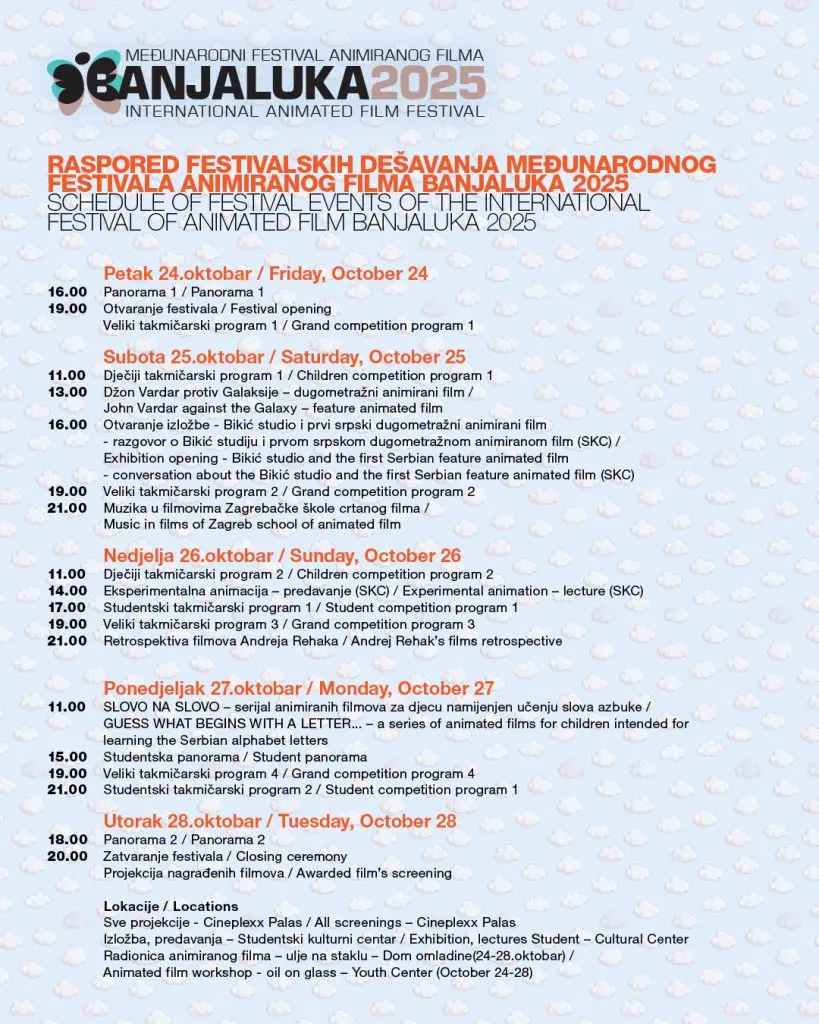 Sve projekcije biće održane u banjalučkom Cineplexxu “Palas”, dok će dio festivalskih dešavanja biti realizovan u Studentskom kulturnom centru, u krugu Kampusa Univeziteta u Banjaluci.