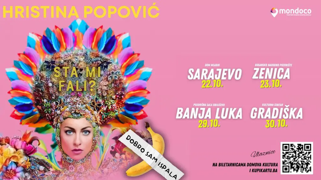 Višestruko nagrađivana glumica Hristina Popović, poznata po ulogama u više od trideset filmskih naslova, dolazi u Bosnu i Hercegovinu sa komičnom monodramom kakvu još niste imali priliku gledati!