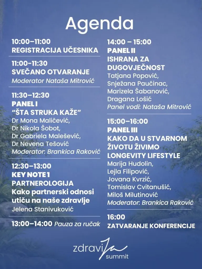 „Dugovječnost danas nije samo pitanje godina, već kvaliteta života koji gradimo svakodnevno. Naš cilj je da kroz ZdraviJa Summit inspirišemo ljude da preuzmu aktivnu ulogu u svom zdravlju i donesu odluke koje će dugoročno napraviti razliku“, izjavila je Nataša Mitrović, osnivačica platforme ZdraviJa.