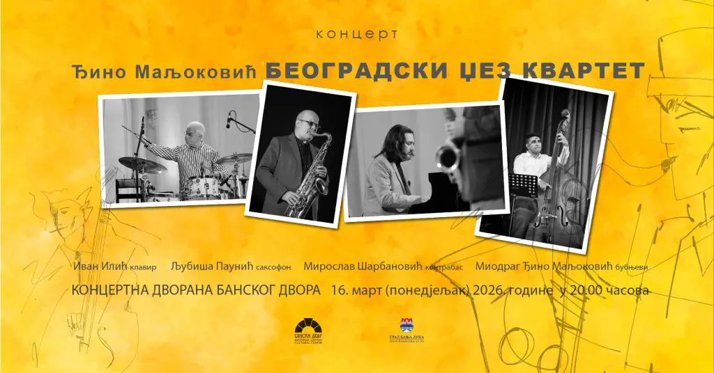 U Koncertnoj dvorani Banskog dvora 16. marta (ponedjeljak) 2026. godine u 20.00 časova održaće se koncert BEOGRADSKOG DŽEZ KVARTETA proslavljenog džez bubnjara MIODRAGA ĐINE MALJOKOVIĆA.