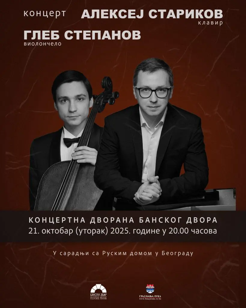U Koncertnoj dvorani Banskog dvora 21.oktobra (utorak) 2025. godine u 20.00 časova održaće se koncert renomiranih ruskih umjetnika GLEBA STEPANOVA (violončelo) i ALEKSEJA STARIKOVA (klavir) pod nazivom REMEK – DJELA RUSKE MUZIKE — POVODOM 185. GODIŠNJICE ROĐENJA P. I. ČAJKOVSKOG.