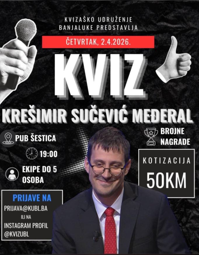 Kviz scena u gradu na Vrbasu sutra će doživjeti svoj vrhunac. Kvizaško udruženje Banjaluke (KUBL) predstavlja poseban događaj – gostovanje najpoznatijeg „lovca“ iz popularnog kviza Potjera, Krešimira Sučevića Međerala.