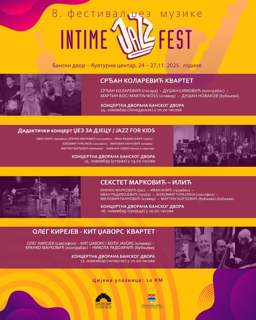 U organizaciji Banskog dvora – Kulturnog centra u Banjaluci će se od 24 – 27.11.2025. godine održati 8. festival džez muzike INTIME JAZZ FEST.