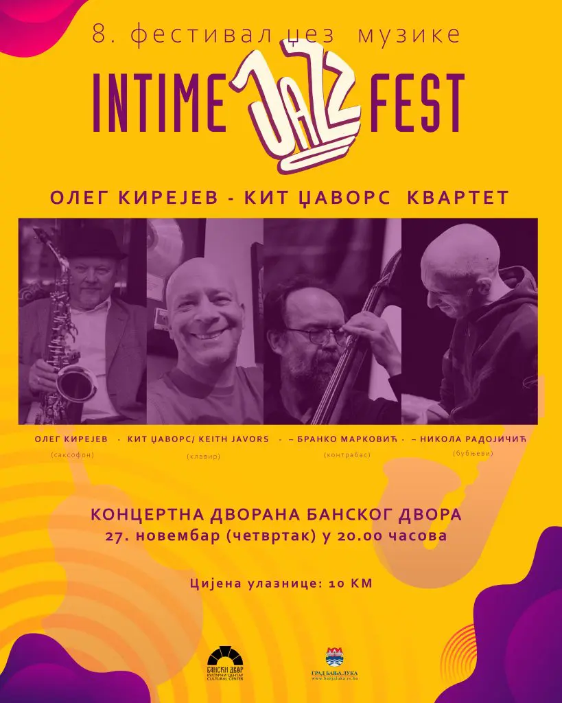 Završnica 8. festivala džez muzike INTIME JAZZ FEST biće spektakularna jer će 27. novembra 2025. godine u 20.00 časova, na sceni Banskog dvora nastupiti jedan od najuzbudljivijih kvarteta današnje džez scene – OLEG KIREJEV – KIT DŽEVORS KVARTET.