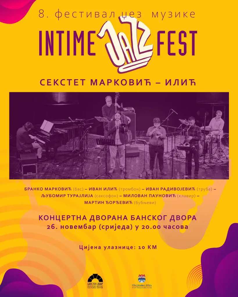 Sa velikim zadovoljstvom možemo najaviti da će se treće večeri 8. festivala džez muzike INTIME JAZZ FEST, 26. novembra (srijeda) 2025. godine u 20.00 časova održati koncert renomiranog SEKSTETA MARKOVIĆ – ILIĆ. Ovo je sastav koji spaja generacijski različite, ali izuzetno talentovane i kreativne muzičare koji pripadaju samom vrhu srpske džez scene. Sastav čine: Branko Marković – bas, Ivan Ilić – trombon, Ivan Radivojević – truba, LJubomir Turajlija – saksofon, Milovan Paunović – klavir, Martin Đorđević – bubnjevi.