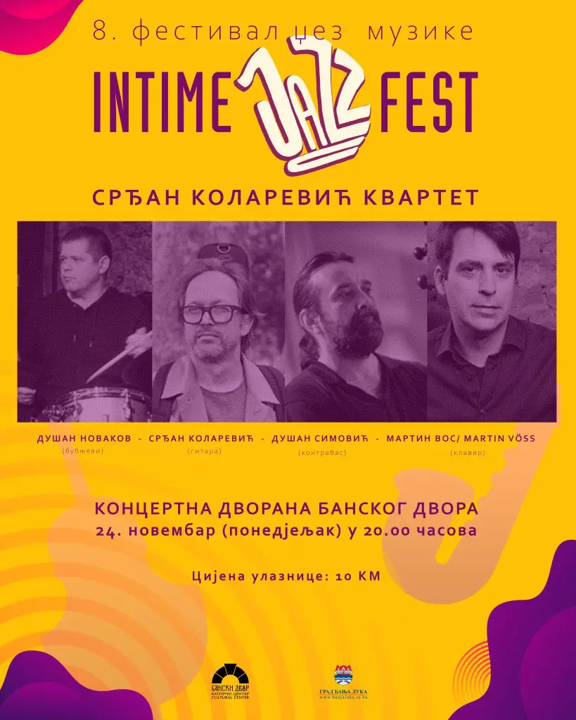 Čast da otvori 8. festival džez muzike INTIME JAZZ FEST, 24. novembra (ponedjeljak) 2025. godine u 20.00 časova u Koncertnoj dvorani Banskog dvora, pripala je Srđanu Kolareviću, jednom od najzapaženijih Banjalučana na internacionalnoj džez scenii i njegovom SRĐAN KOLAREVIĆ KVARTETU. Ovaj vrhunski kvartet donosi na banjalučku scenu energiju i raskoš modernog džeza, prožetu iskrenom emocijom, improvizatorskom slobodom i muzičkom zrelošću.