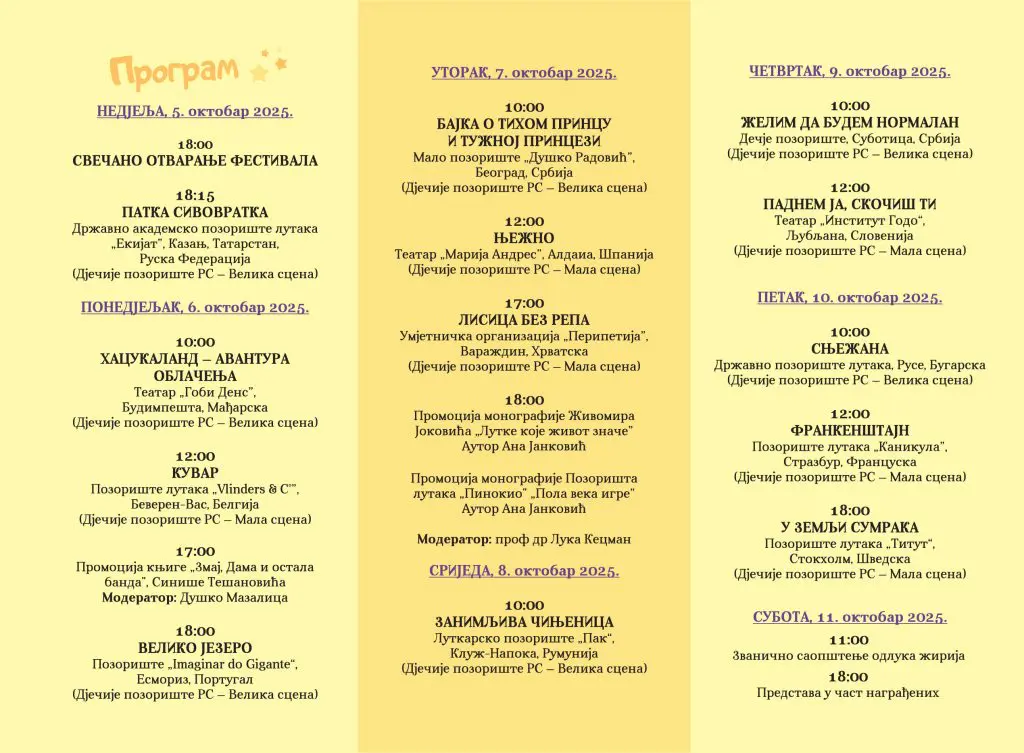 Iz Dječijeg pozorišta su naveli da publiku očekuje 14 izvođenja različitih naslova, kako bi se predstavilo savremeno svjetsko lutkarstvo i primjena različitih tehnologija u izradi lutaka.