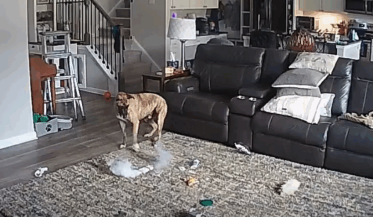 Kućna kamera zabilježila je trenutak kada je pas zapalio kuću u kojoj živi, jer je glodao bateriju. Zapanjujući snimak prikazuje psa Koltona kako žvaće litijumsku bateriju u dnevnoj sobi i kamera hvata trenutak kad se zapalio tepih, ali je požar brzo ugašen.