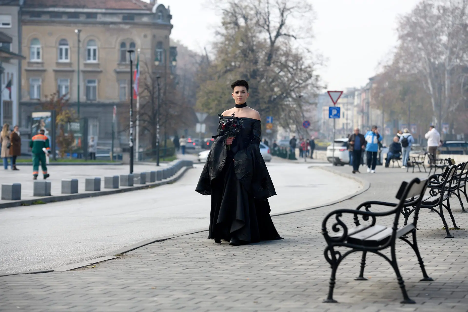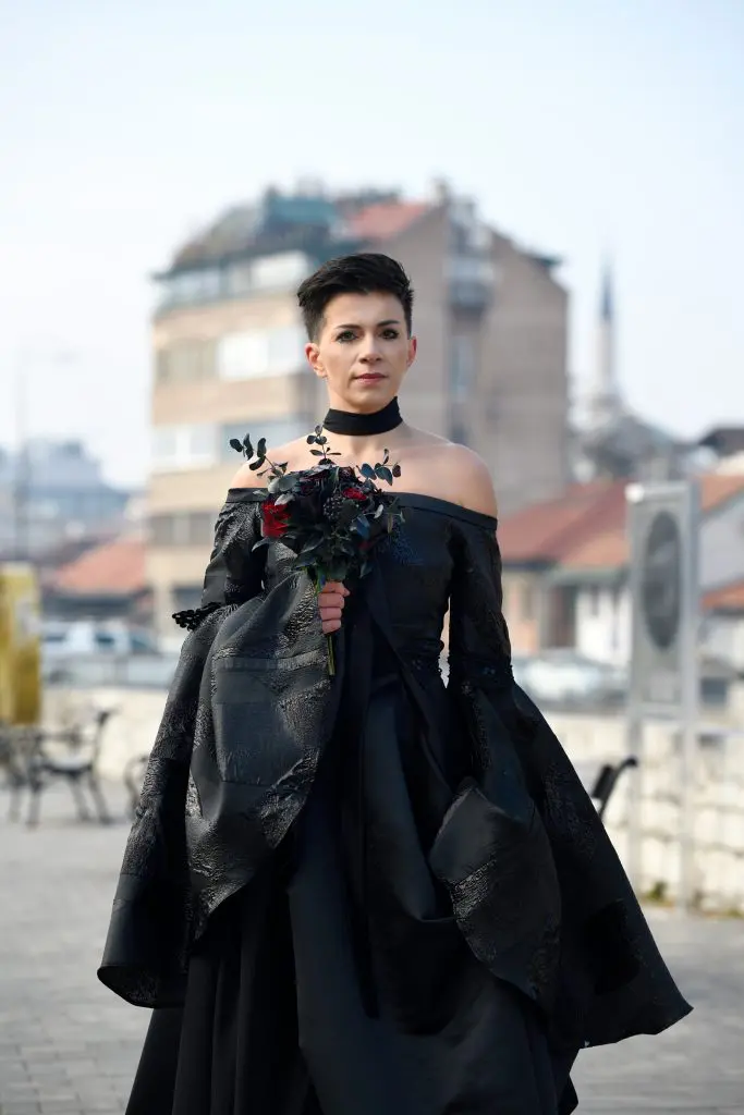 Bez svadbene povorke, bez radosti. Umjesto osmijeha na licu, pogled u daljinu. Potpuno mirna i tiha, kao bez glasa. U crnoj elegantnoj vjenčanici, s crnim bidermajerom u rukama.