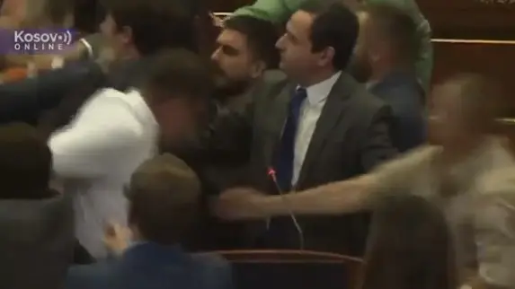 Premijer Kurti je u jednom trenutku poliven vodom i poslanici su počeli da se okupljaju, nakon čega je došlo do tuče, piše Koha.